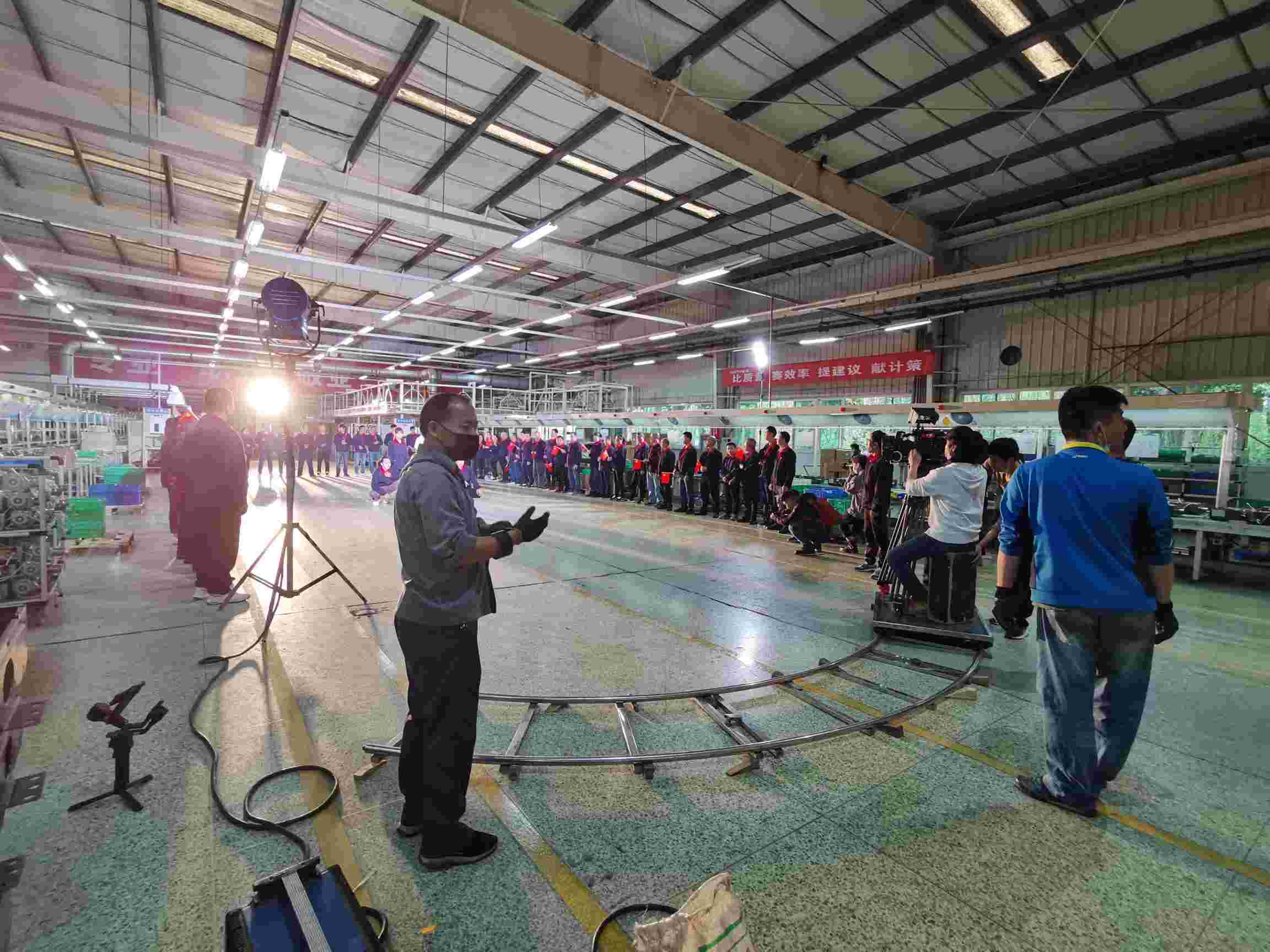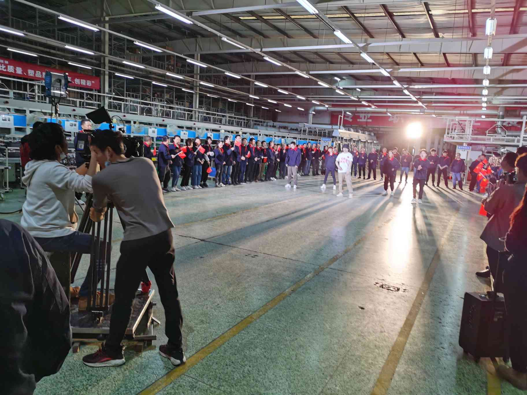 9000平方米的熱水器專配車間,這里被打造成了一個(gè)臨時(shí)的攝影棚——中間留出的一塊空地就是表演舞臺(tái),說(shuō)唱歌手、舞蹈演員,輪番上場(chǎng)錄制。