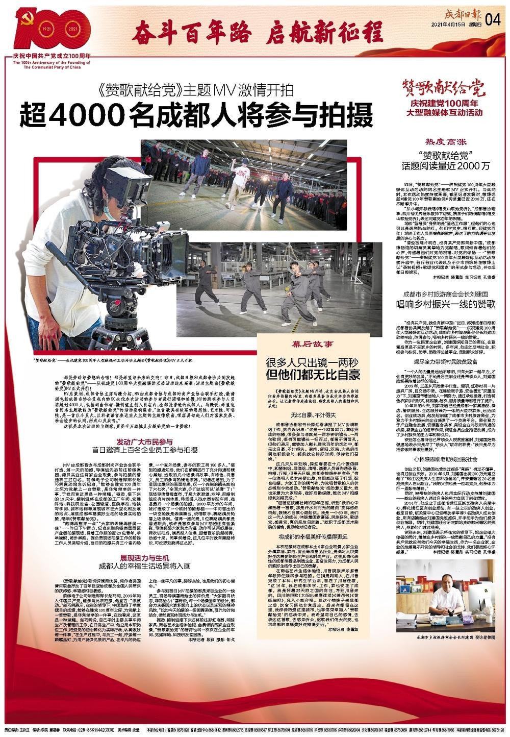 那是勞動(dòng)與夢(mèng)想的合唱!那是希望與未來(lái)的交響!在春回大地的時(shí)節(jié),成都日?qǐng)?bào)和成都市音協(xié)共同發(fā)起的“贊歌獻(xiàn)給黨”——慶祝建黨100周年大型融媒體互動(dòng)活動(dòng)也迎來(lái)高潮:活動(dòng)主題曲《贊歌獻(xiàn)給黨》MV在前鋒集團(tuán)西區(qū)產(chǎn)業(yè)園開機(jī)!充滿朝氣、朗朗上口的旋律,將從這一刻開始在城市的上空回蕩。
